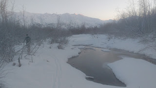 After skiing 3 miles from the Arctic Valley Trailhead, this is where the trail meets Ship Creek for the first time. If this section of creek isn't frozen, there is another trail that shoots to the left at this exact location that you can follow for another 2-3 miles.